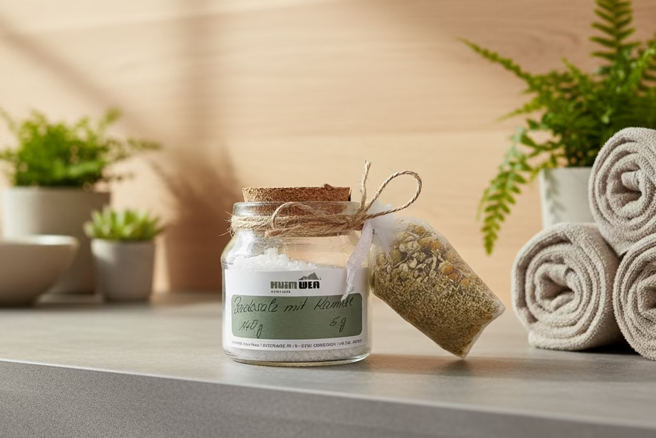 Gib etwas von dem Badesalz in dein warmes Badewasser. Öffne eines der Kamillensäckchen und lasse ein paar Kamillenblüten zusätzlich ins Wasser gleiten. Lehne dich zurück, atme tief durch und genieße dein persönliches Entspannungsritual.