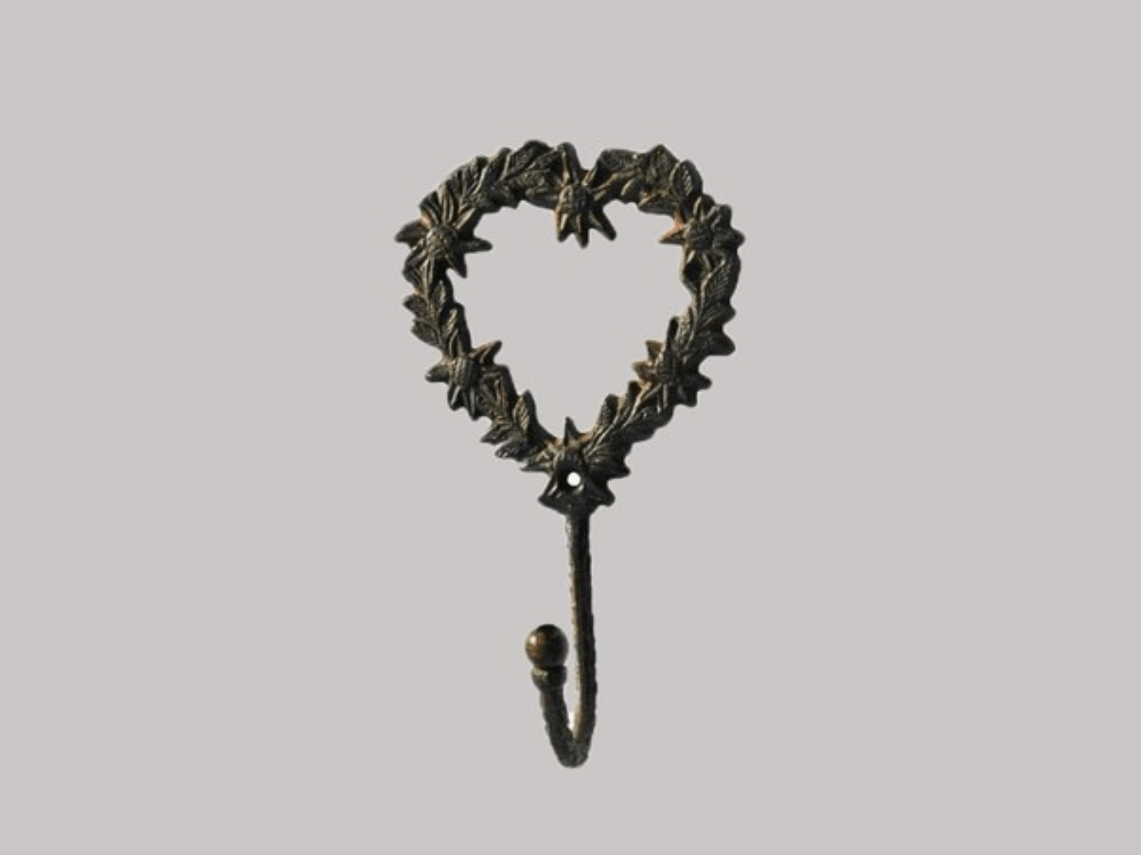 Der rustikale Haken in Form eines Herzens verleiht Ihrem Eingangsbereich eine verspielte Note, während Ihre Kleidung ordentlich aufgehängt wird. Perfekt für diejenigen, die ihrem Zuhause eine persönliche Note geben möchten.