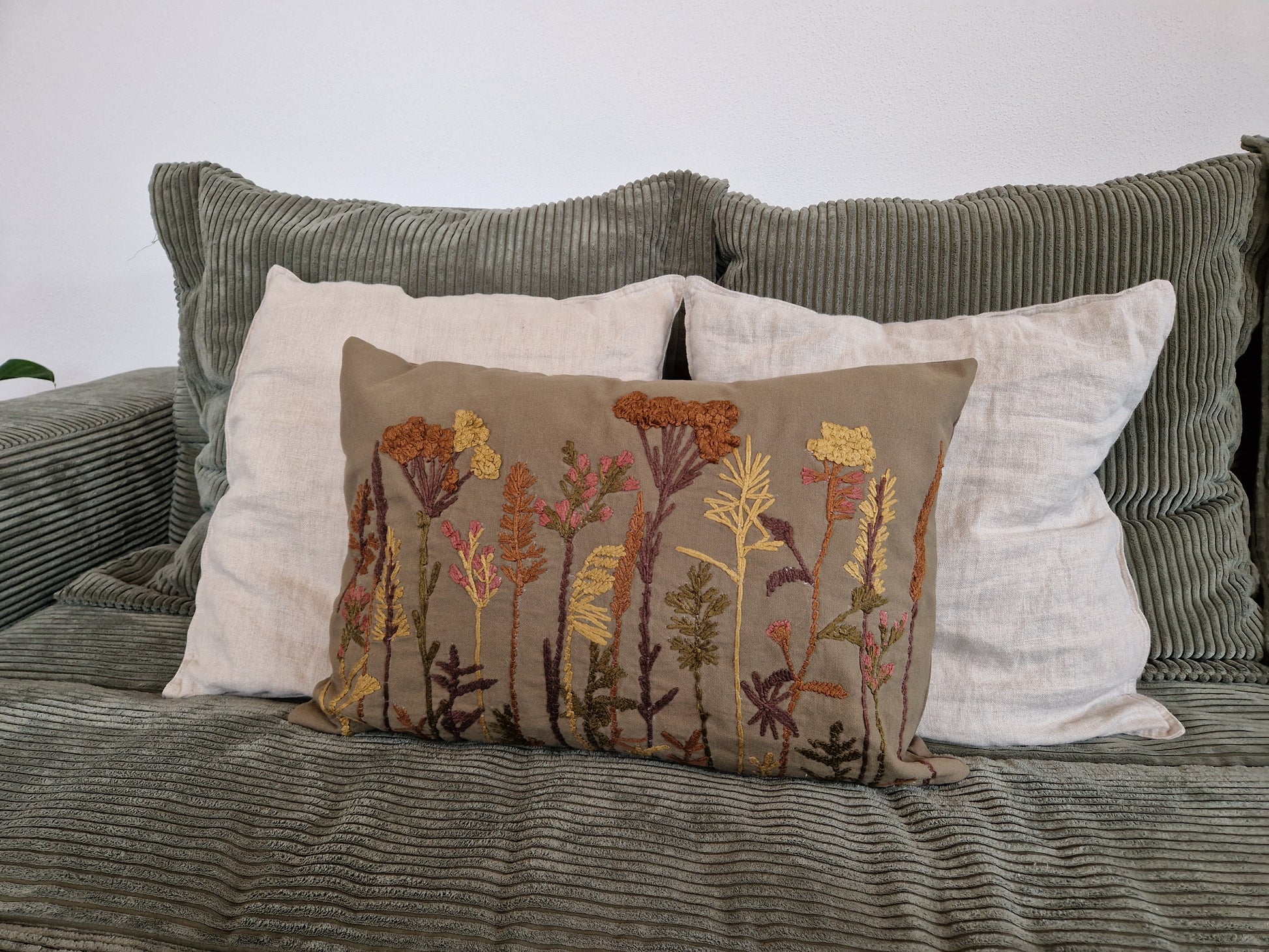 Leinenkissen bestickt - Gräser und Blumen grün