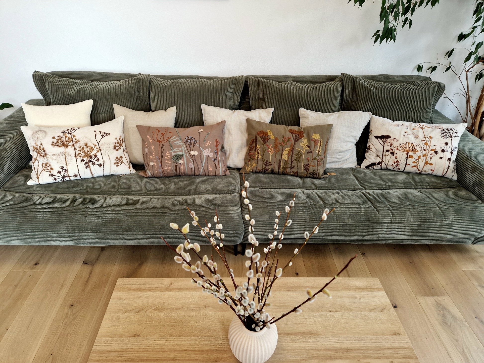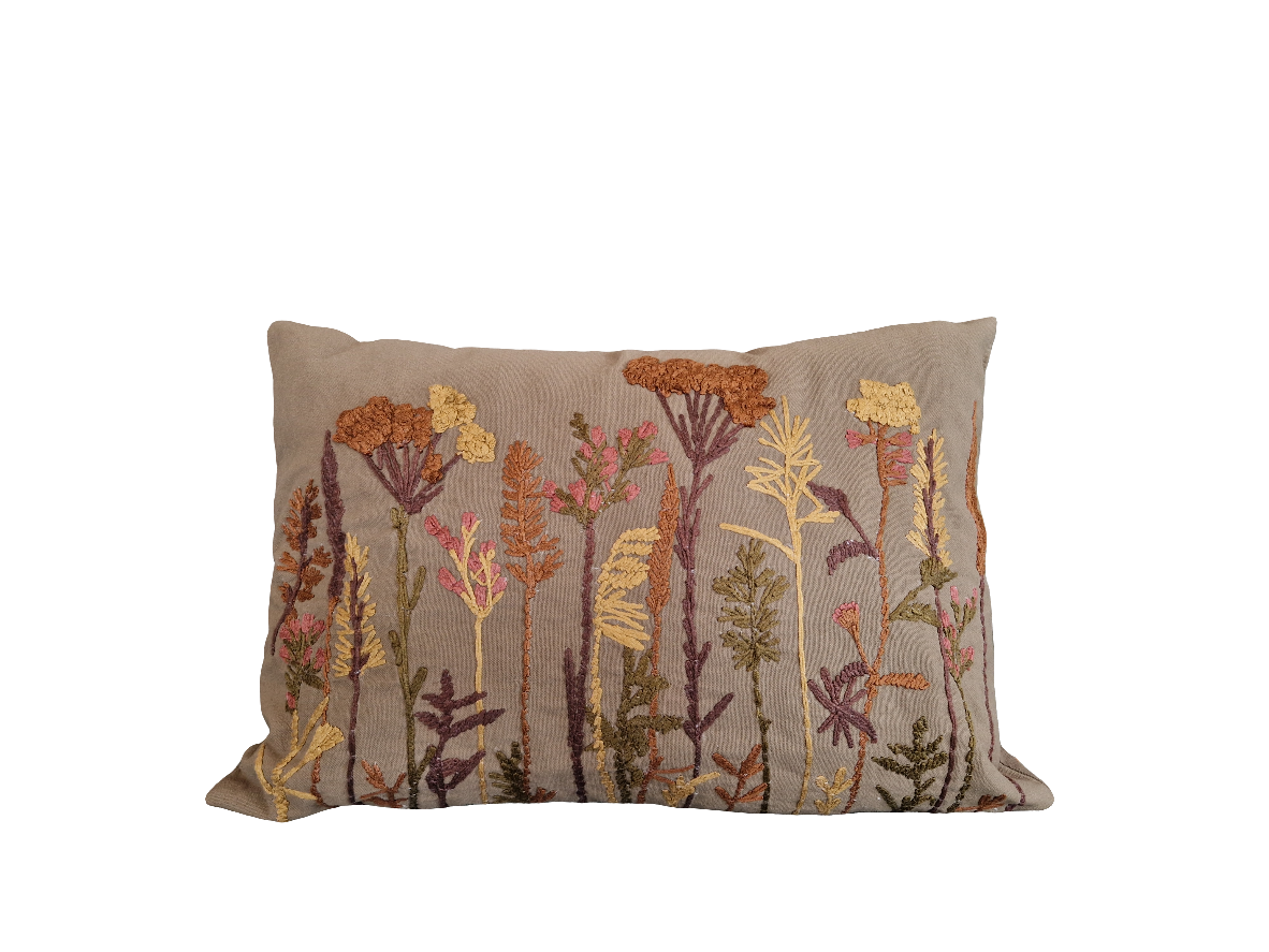 "Verschönere dein Zuhause mit diesem edlen Leinenkissen, bestickt mit zarten Blumen und Gräsern. Hergestellt aus hochwertigem Material, verleiht es jedem Raum eine besondere Note.
