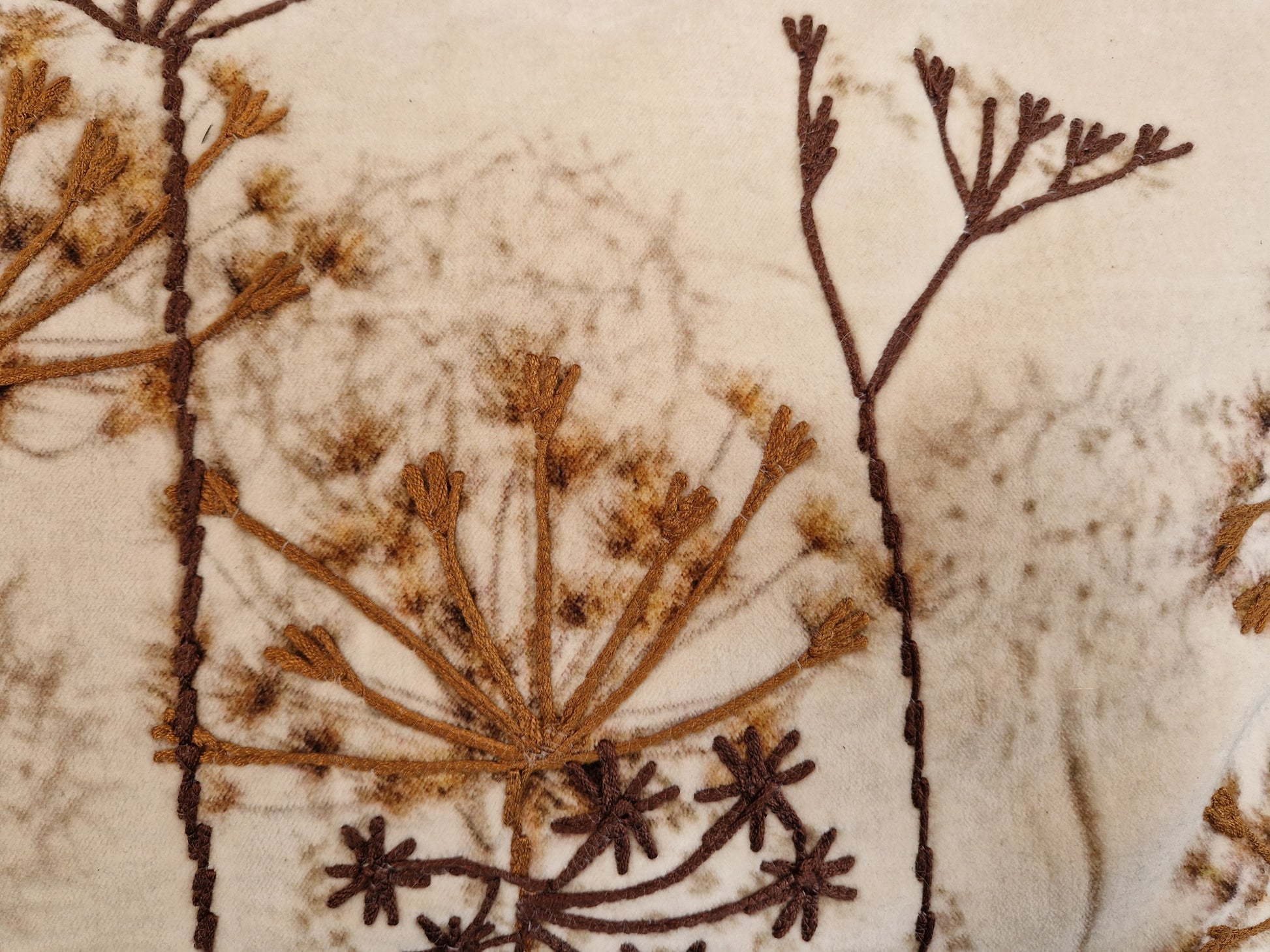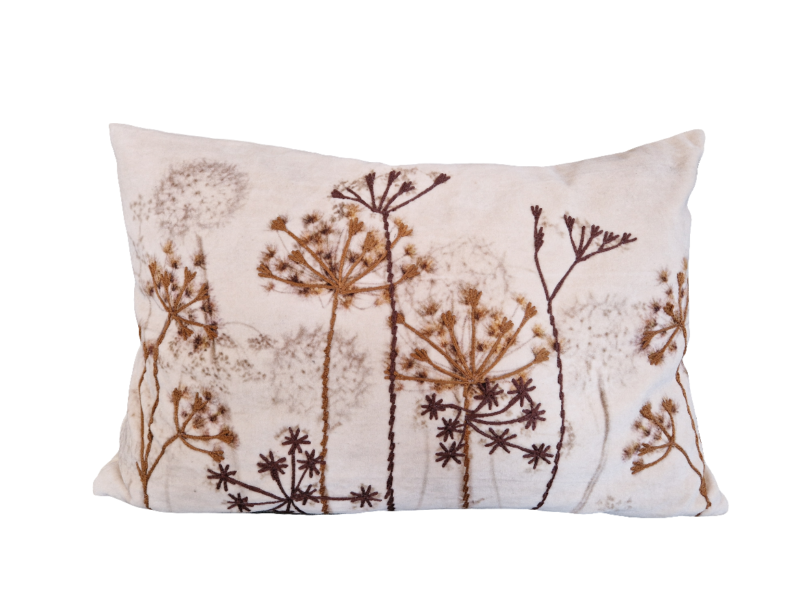 "Verschönere dein Zuhause mit diesem edlen Samtkissen, bestickt mit zarten Blumen und Gräsern. Hergestellt aus hochwertigem Material, verleiht es jedem Raum eine besondere Note.