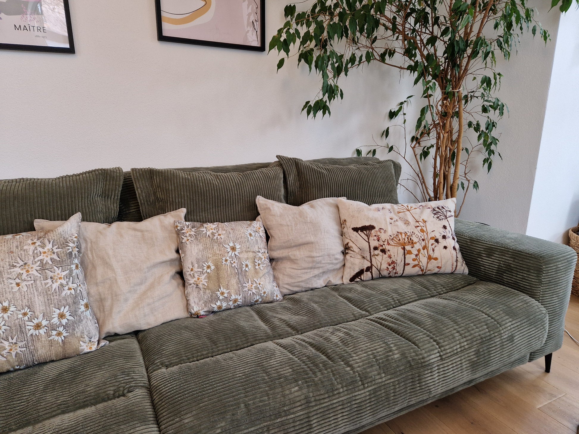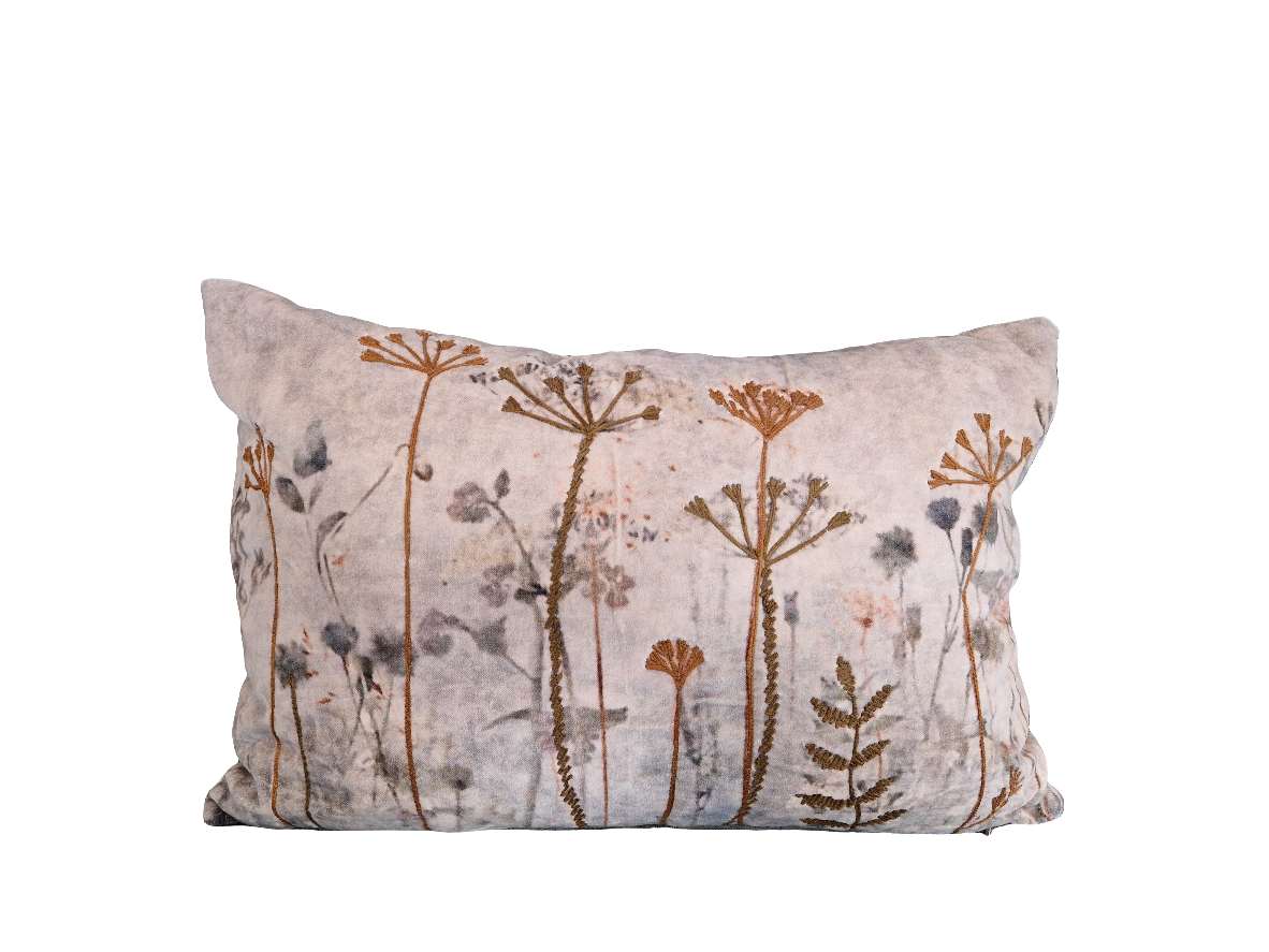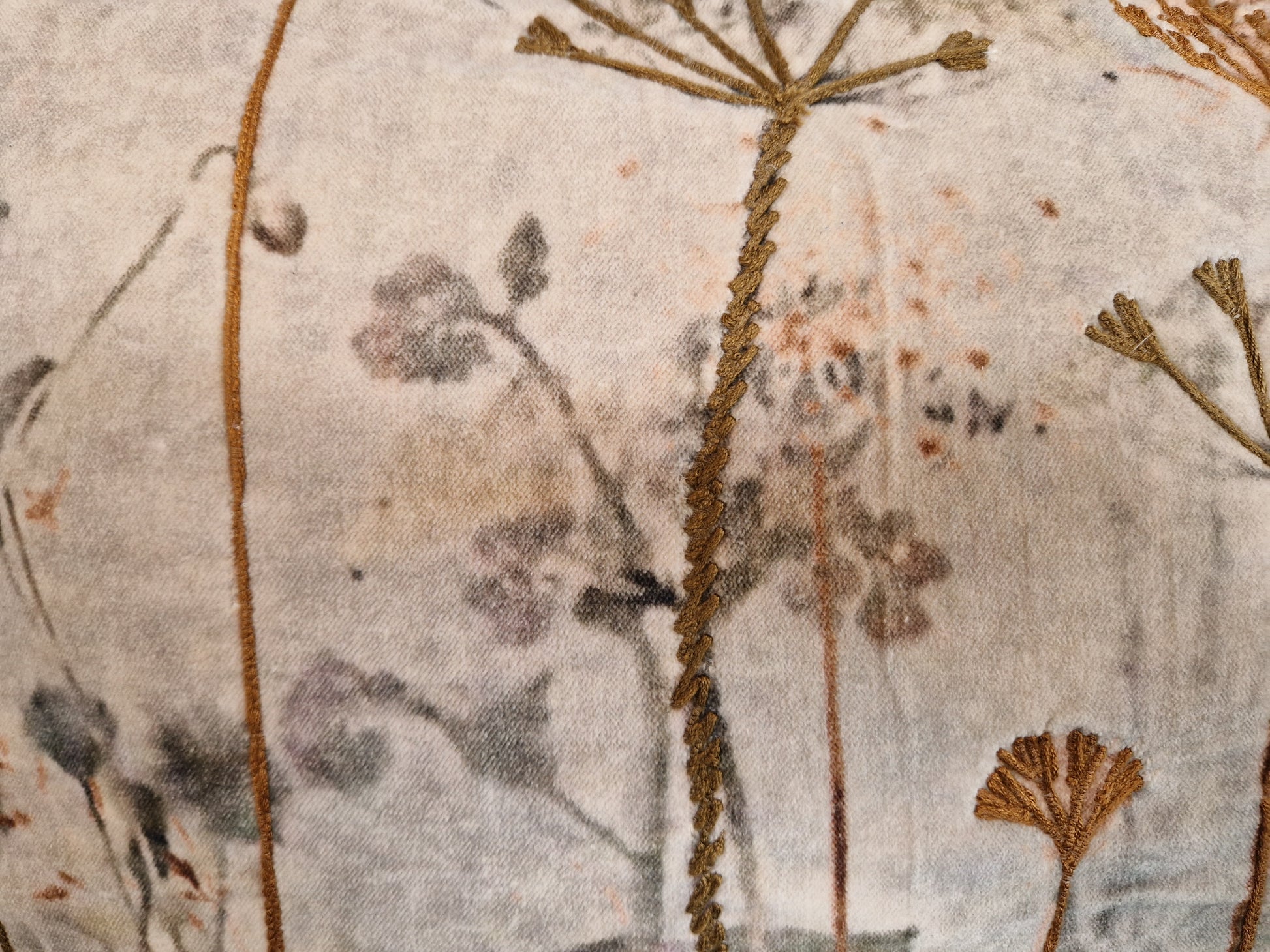 "Verschönere dein Zuhause mit diesem edlen Samtkissen, bestickt mit zarten Blumen und Gräsern. Hergestellt aus hochwertigem Material, verleiht es jedem Raum eine besondere Note.
